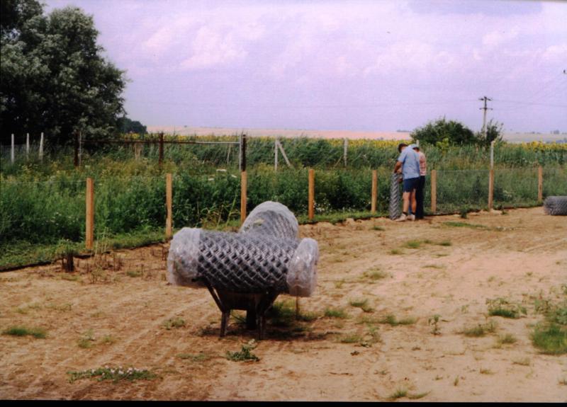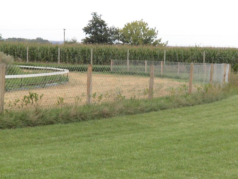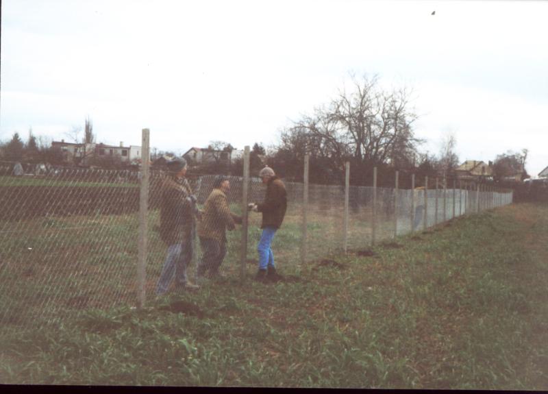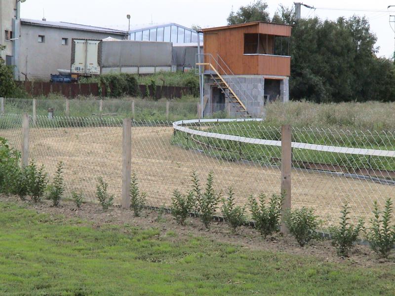 Celý areál aby mohol slúžiť svojmu účelu, bolo nutné oplotiť. Oplotenie slúži k vytýčeniu priestoru a v neposlednom rade tiež k zabráneniu svojvoľného vnikania nepovolaných osôb a zabehnutiu chrtov. Oplotenie je riešené klasickým ohradovým pletivom výšky 150 cm. Je vedené na betónových stĺpikoch v rozstupoch 3 m. Vstup do areálu je riešený dvomi bránami šírky 4 a 6 m. Jedna slúži k vstupu návštevníkov a účastníkov. Druhá slúži k vstupu aj ťažších mechanizmov na prípadné nutné úpravy. Pozdĺž oplotenia je navrhnutá výsadba okrasných drevín – vtáčieho zobu. Celková dĺžka oplotenia je cca 600 m.