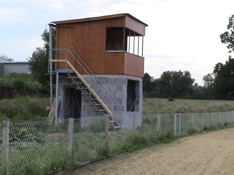 Rozhodcovská veža slúži na regulárne odsledovanie priebehu dostihov a je umiestnená v cieli. V jej priestoroch je navrhnuté miesto pre rozhodcov, časomerača, hlásateľa, obsluhu zariadení umiestnených na veži. Je v jednoposchodovom prevedení. Pôdorys zaberá 16 m2. Na betónových základoch je z tvárnic vymurované prízemie, poschodie je montované. Čelná strana je presklená oknami, aby bol čo možno najlepší výhľad. Veža je napojená na rozvod elektriky.